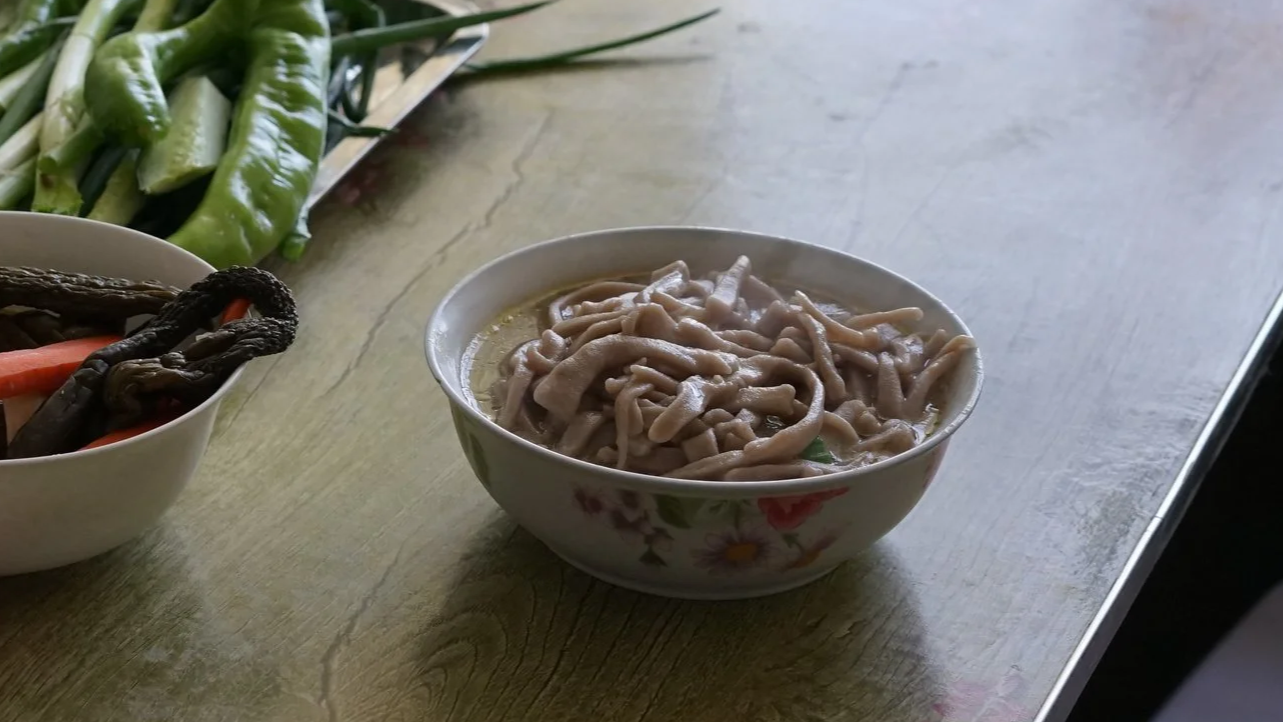 まずは蕎麦。上の写真でご覧いただいた血のソーセージにして食べるケースが多いのですが、沸かして冷ました水で蕎麦粉を練って、そば切りのような状態にした麺を、鶏ガラスープ(もしくは羊をまる茹でしたあとのスープ)で煮込んで食べるというのも一般的です。ちなみに、鶏ガラスープをとる作業も、生きた鶏を締めるところから始まります(笑)