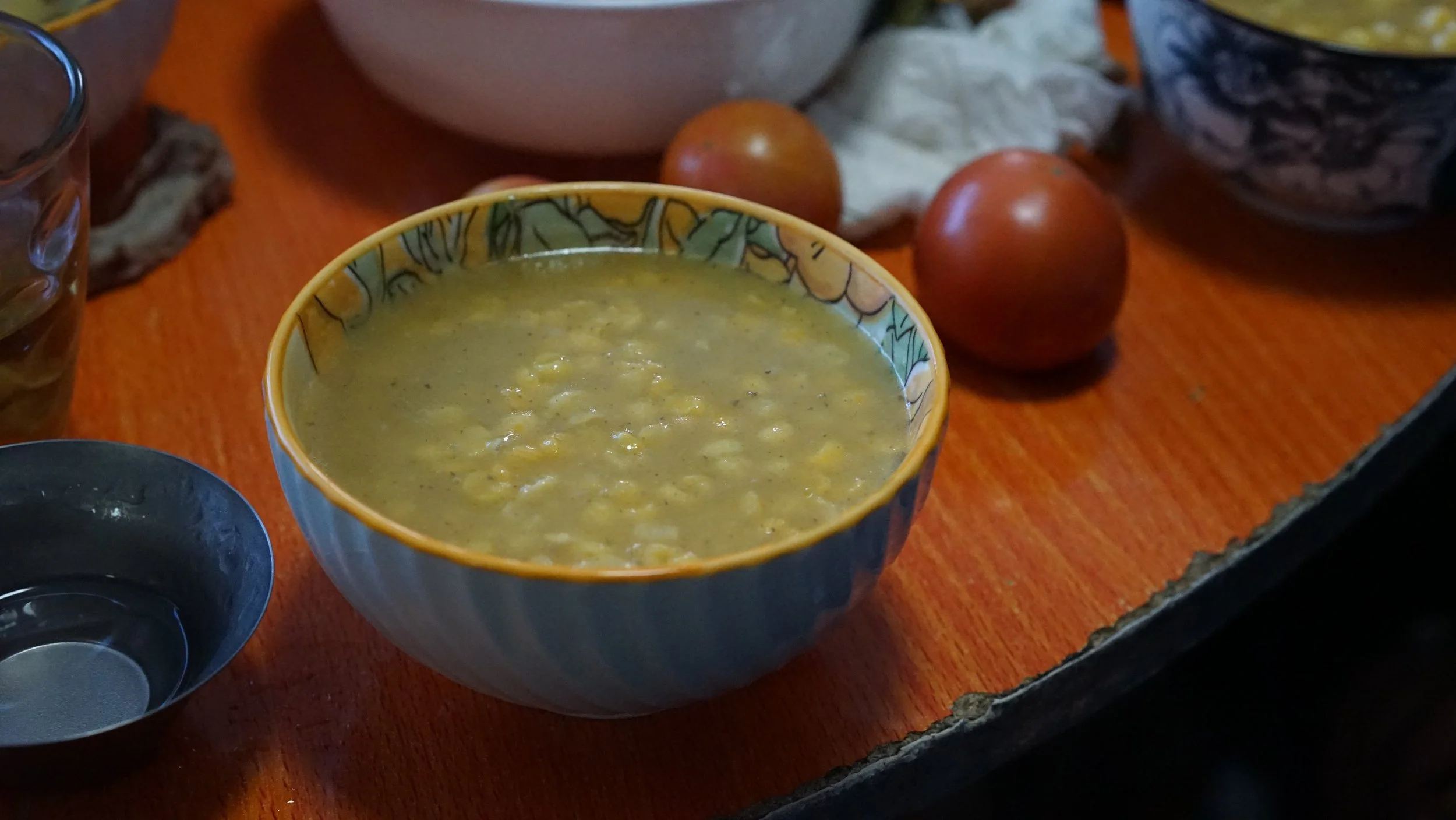 ついでトウモロコシ。収穫後に粒の状態で乾燥させたトウモロコシを水で戻し、羊のスープで煮込んだ“トウモロコシ粥”が下の写真。宴会のシメにも、朝ごはんにも登場する一品です。