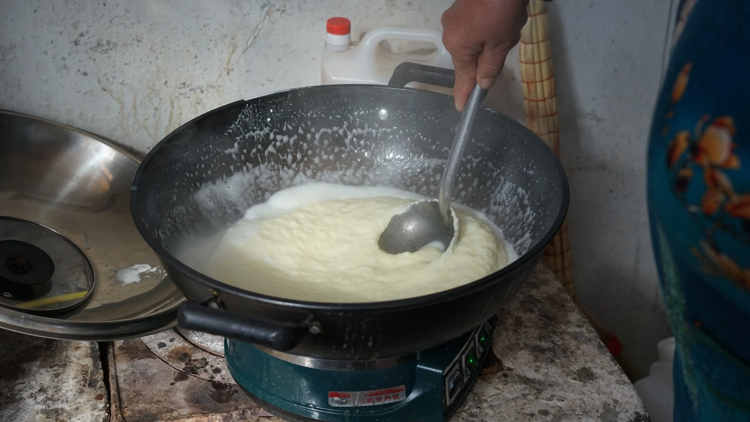 乳酸発酵させた生乳を加熱すると、次第に粘度を持った固形物へ変化。