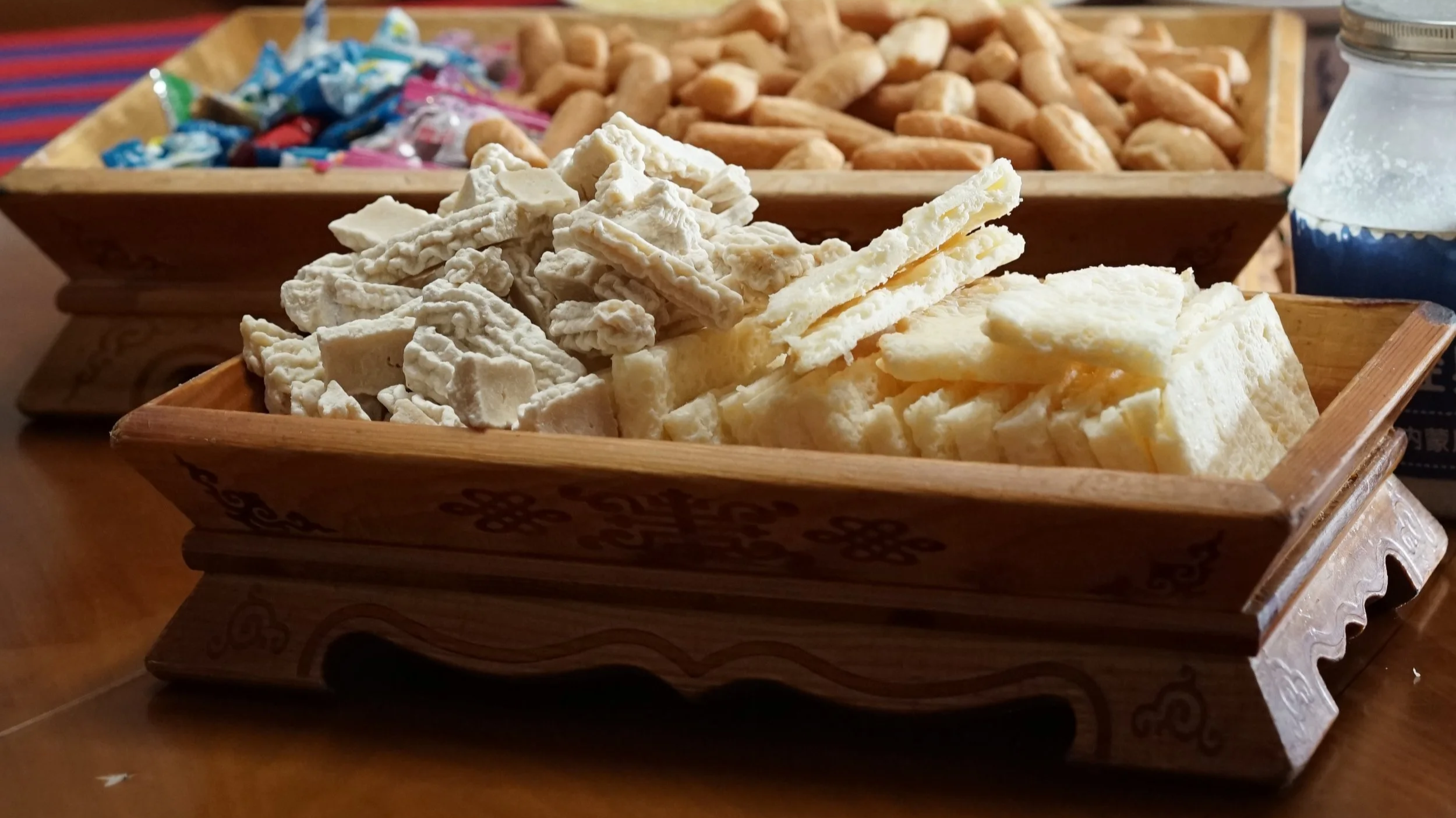 写真の右側にある白いせんべいのようなものは、生乳を弱火で加熱し、表面にできた脂質の膜を幾重にも重ねて引き上げ、乾燥させたもの。これはモンゴル語で「ハクサスンウルム」と呼ばれ、ミルクティに浮かべてふやかしながら食べます。左の食品は、発酵乳を加熱して水分を飛ばし、布で包んで重しをして水切りした後、天日で乾燥させたもの。乾燥ヨーグルトとでも表現したくなる味わいで、「アーロール」と呼ばれています。